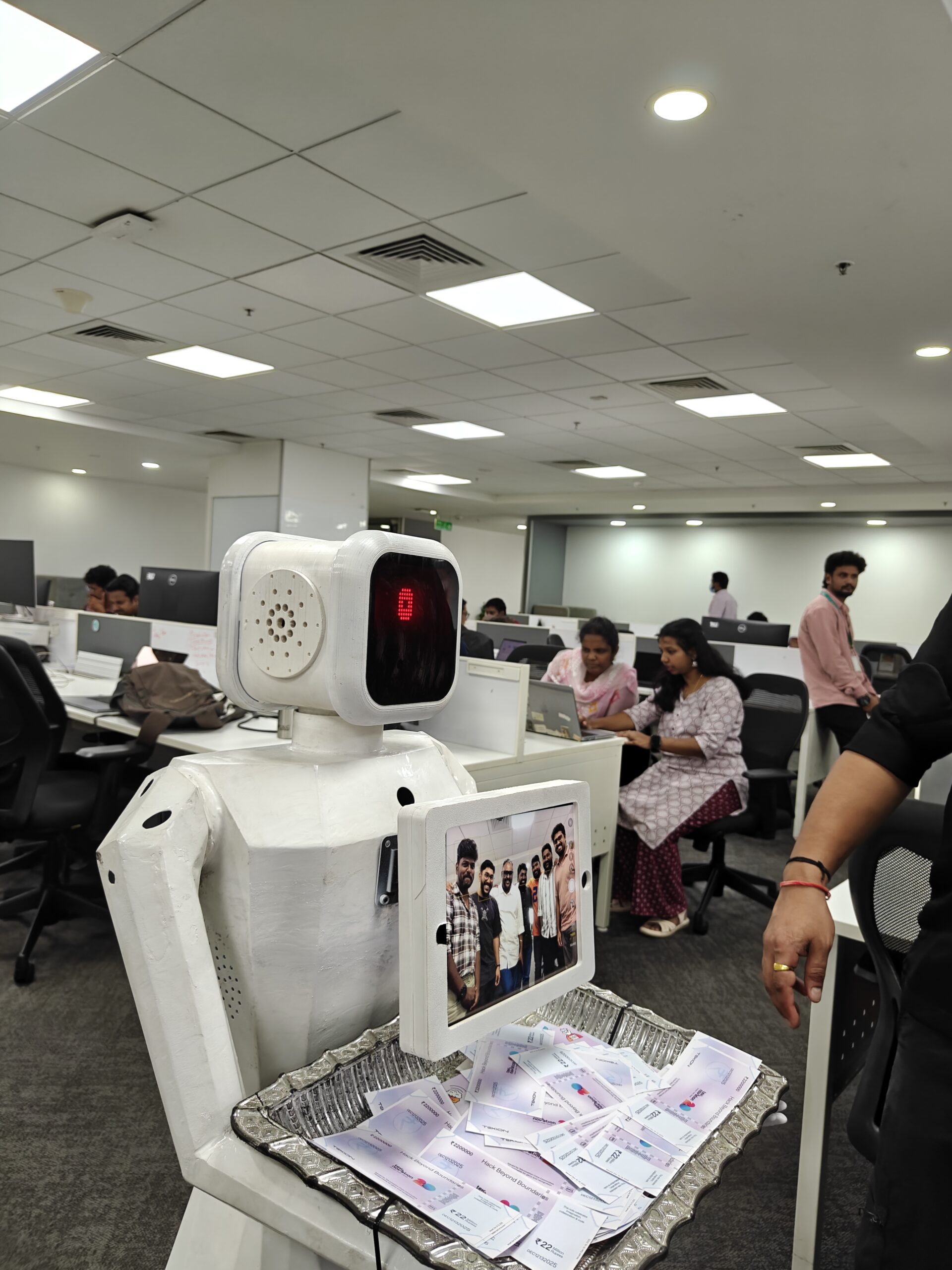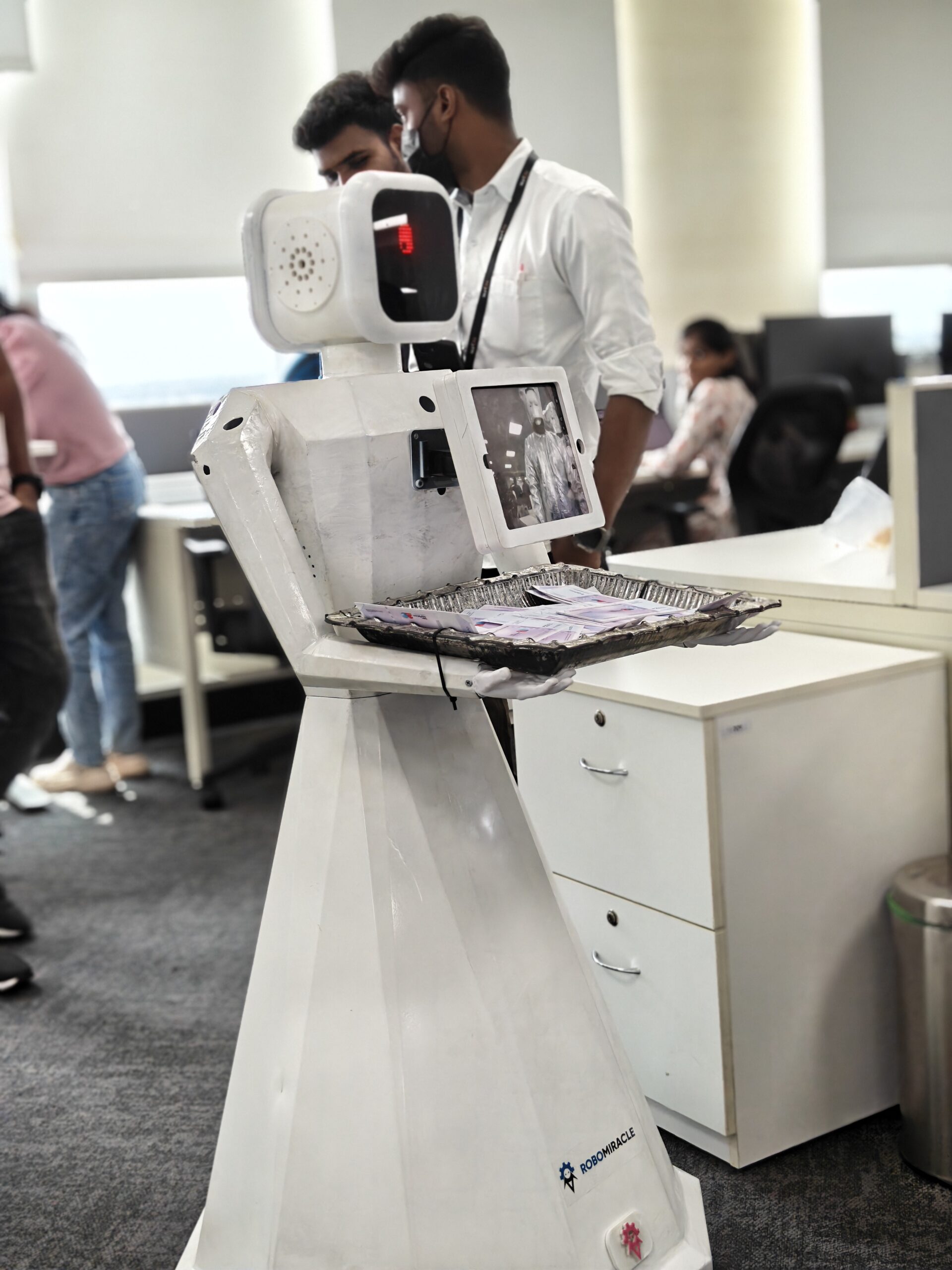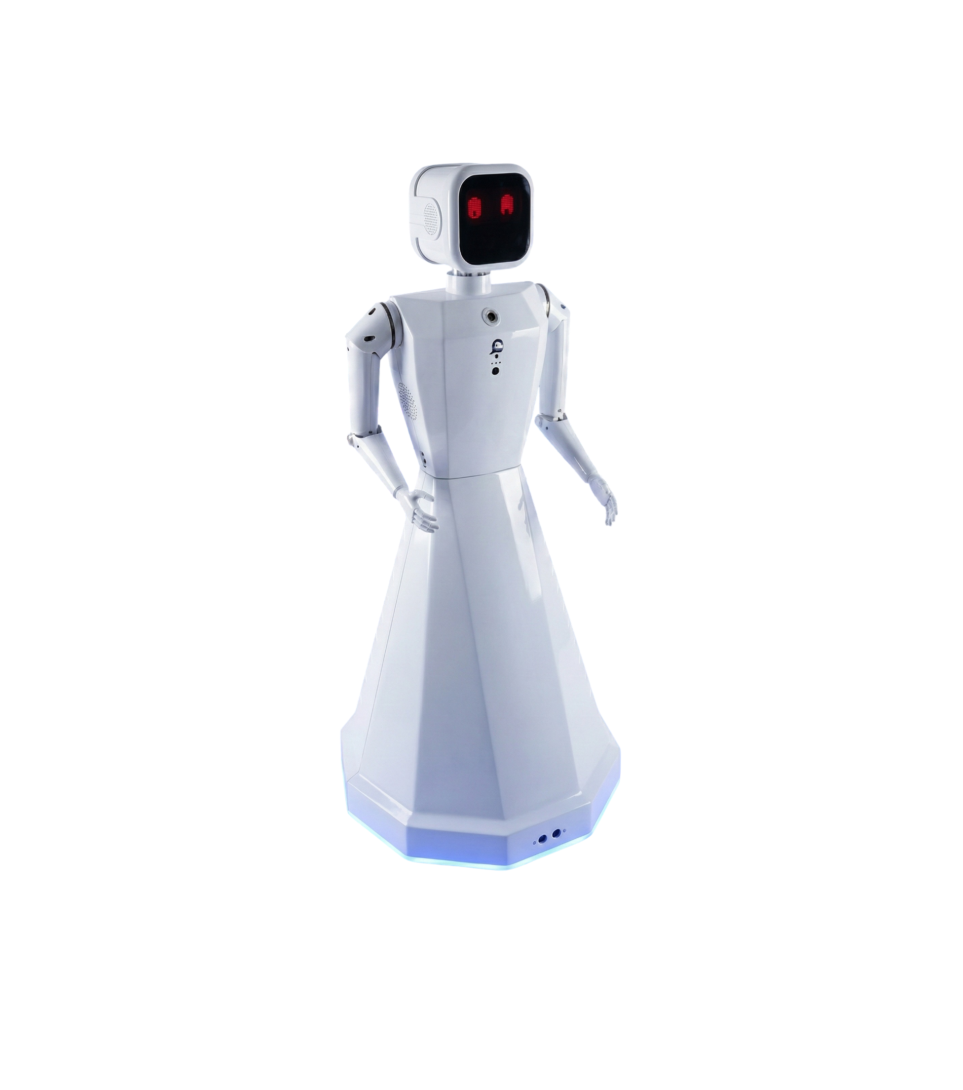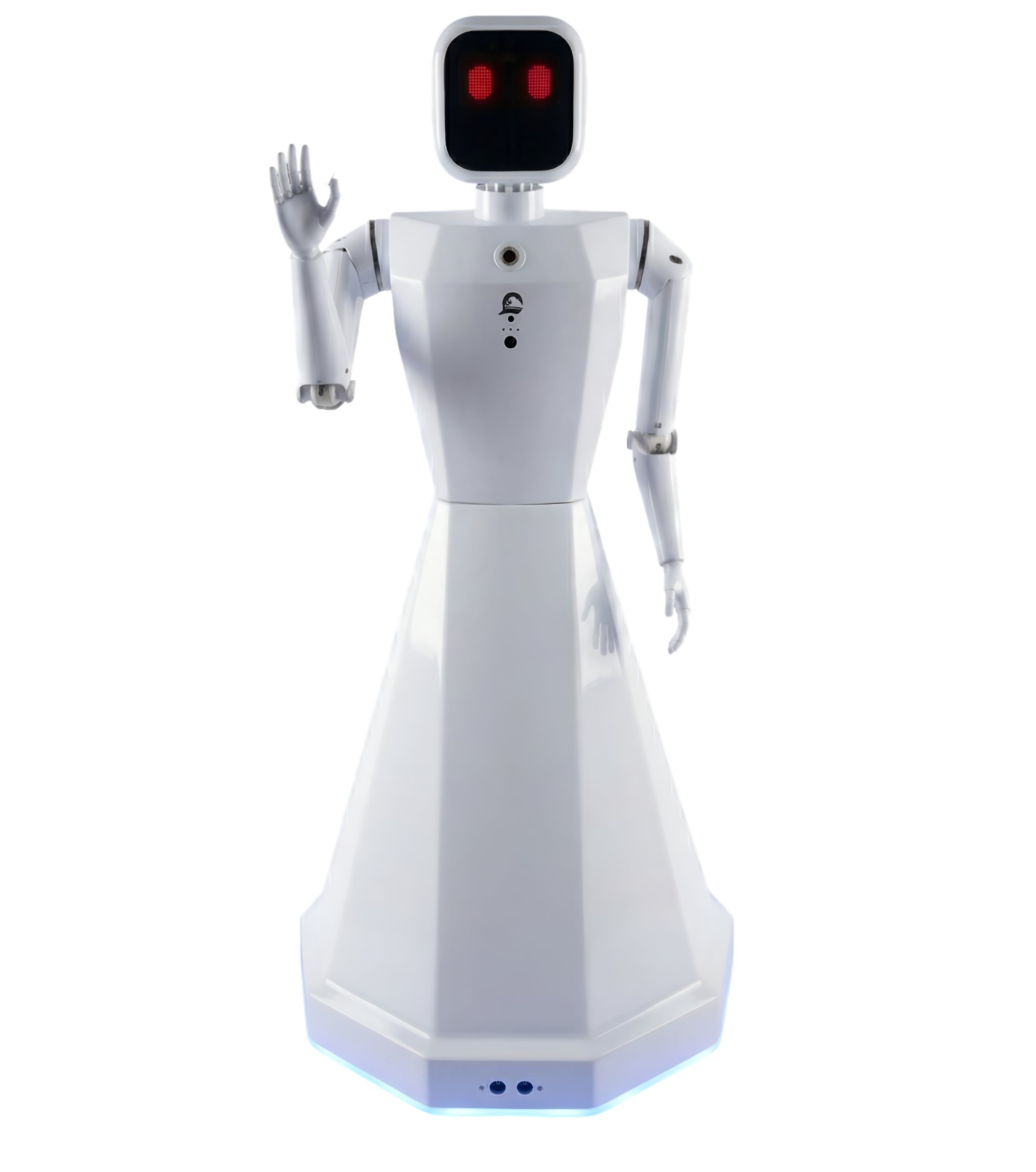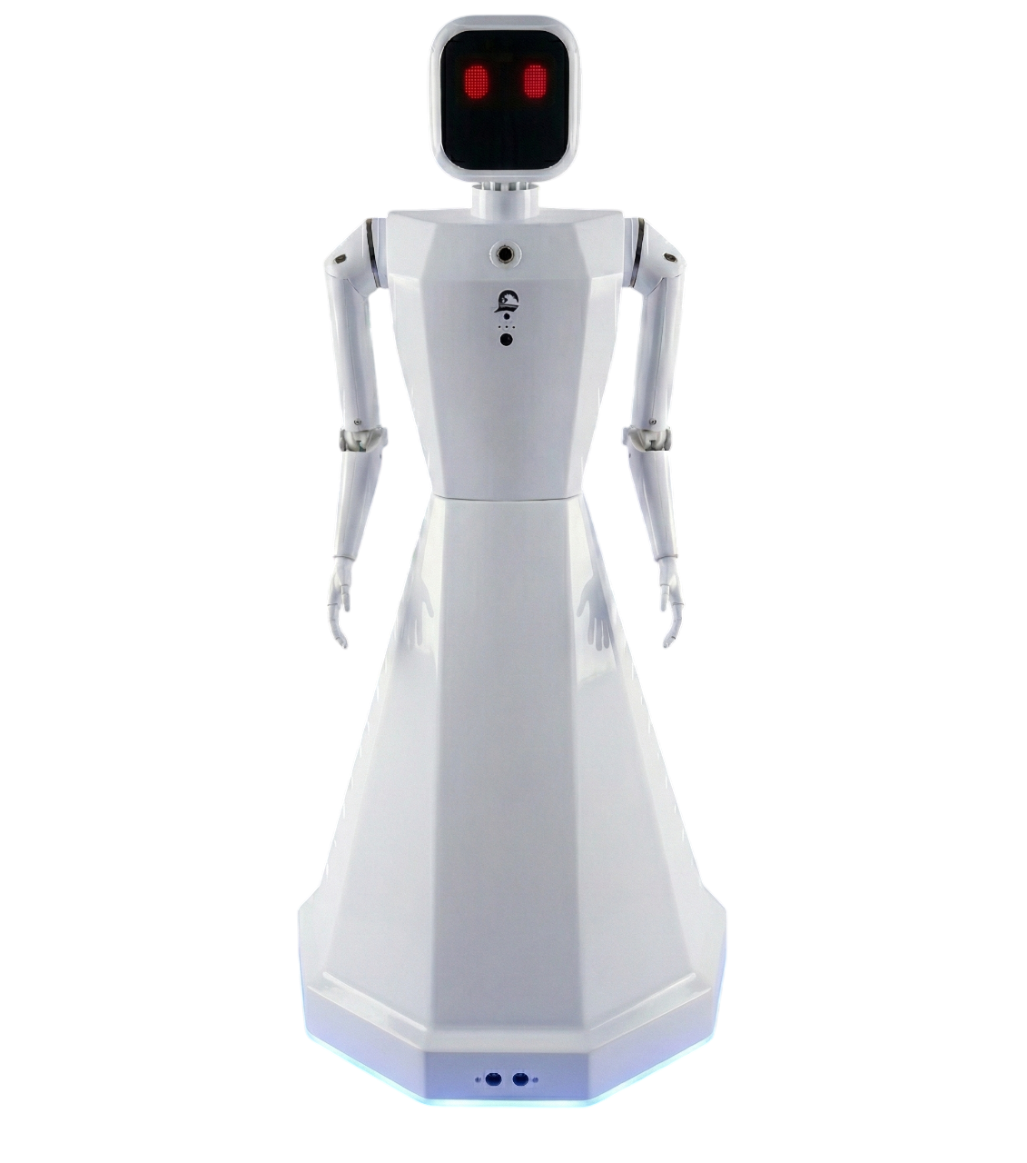 A highly intelligent features combined humanoid robot with Hand movements (2 DOF), voice interaction, wheels for uneven surfaces, intelligent collision avoidance, fast charging remote controlled and autonomous with head movement and eye movements integrated with AI